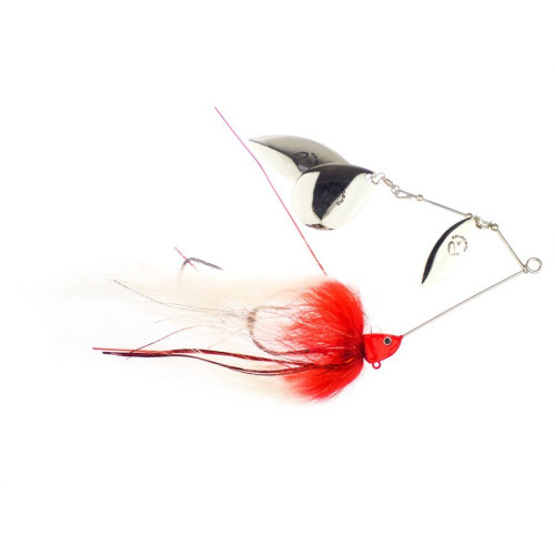 Spinnerbait in a huge size. With a super-long main frame that guarantees superb action and hook-up rate. Twist locked fame eye, swinging stinger hook. The head has an eye under the belly so it is easy to add extra weight to fish at any desired depth. The changeable blade option, between Willow and Colorado blade, gives two action styles and work depths. • Large stainless steel wire frame • Changeable Main blade options – Willow and Colorado supplied • Eye to attach additional weight • Real yak hair tassel • Main hook in size # 8 and swinging stinger hook