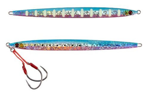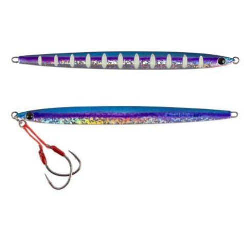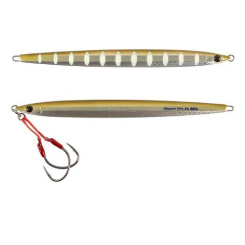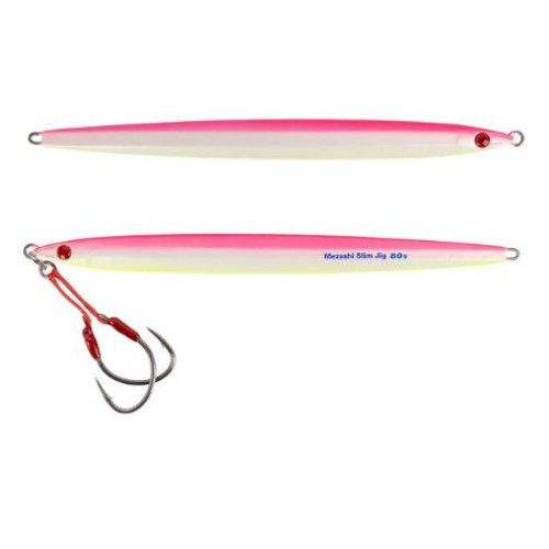 Mustad's Mezashi Slim Jig is designed to provide maximum attraction and performance whether you're pulling game from the depths or casting from the shore. You have a better shot at landing a fish thanks to a pair of light wire slow jigging hooks tied on the front. With its center of gravity shifted slightly forward of the jig's center, this head-side heavy (55:45) slim shape lead jig is made to resist vertical movement against the force of the fishing line. As a part of the Mezashi Series of lures, the Mezashi Slim Jig has Mezashi transparent eyes, which refract light and serve to entice a strike. With 5 different weights and 8 unique patterns to choose from, the Mezashi Slim Jig offers versatile options for any fishing situation. The construction from hard lead alloy makes it resistant to damage while still being portable and simple to operate.