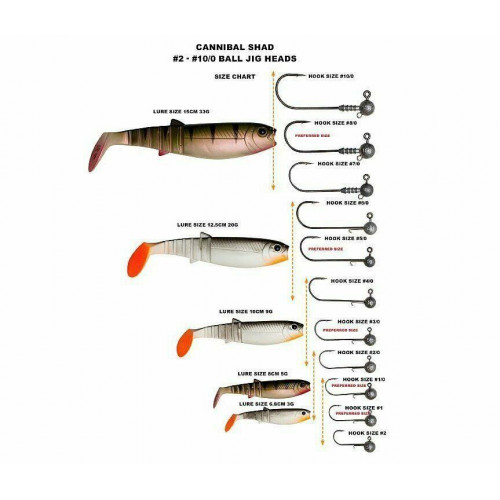 Cannibal je dostupan u četiri veličine: 6.8, 8,10 i 12.5 cm, te dolazi u osam atraktivnih boja: Minnow, Perch, Fire Tiger, Yellow Glow, Black & White, Clown, Blue Pearl i Glitter Bug.