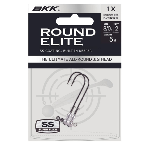 The BKK ROUND ELITE series comes in a wide range of sizes and weights to fit a huge array of lures and target multiple fish species. This versatile round jig head molded around a light wire jig hook with round bend features a super-sharp needle point, SS finish and a precision moulded head fitted with a single wire keeper to minimise damage and hold the lure in place. The head also features an extra eyelet on the bottom to accommodate a treble hook, stinger rig or a blade to improve the lure presentation.