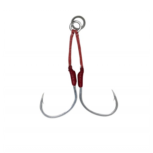 Our Double assist hook range is specially designed to fit perfectly our needle jig and Slim Jig minnow. The super strong and light weight hooks are tied to blood red hollow Fluoro Carbon core PE Braid. The Shape of our Hooks match perfectly the body shape of the most common jigs and the unique Looped rigging gives a superb hook up rate. We have wrapped tied the core all the way to the end of the spade of the hooks, so the hooks move freely and don’t tangle or scratch the jig! Super sharp forged hooks made from Japanese XC75 Carbon Steel and epoxy coated wrappings. Suggested use: Bloody Twin assist hooks have short cord and are ideal for rigging slow jigs from both sides, as well as normal short jigs from one side. They are suggested for Slow jigging, Light jigging, Shore Jigging, Cast Jigging and Vertical Jigging techniques.